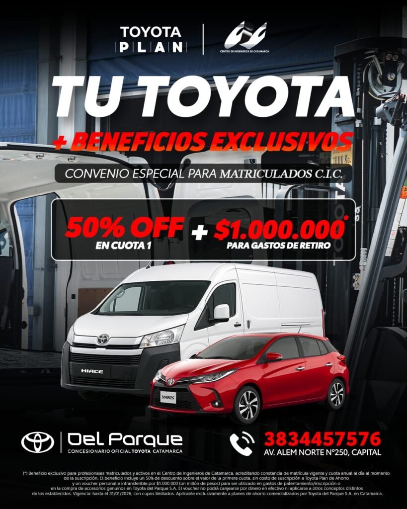 Con la presencia de nuestra Vicepresidente Ing. María de los Ángeles Molina y el Ing. Pablo Avilés de la Concesionaria Toyota del Parque SA, se ha firmado un convenio por el cual al suscribir un plan de ahorro en cualquiera de sus modelos se accederá a una bonificación del 50% del monto de la primera cuota y a un voucher intransferible de $ 1.000.000 para ser utilizado al retirar el vehículo o para la compra de accesorios originales de la marca. Este beneficio tendrá vigencia hasta el 31/5/2026.